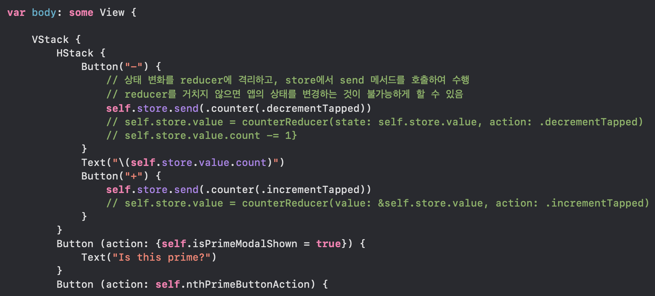 ์ํ ๋ณํ์ ๋ฐ๋ฅธ ํ๋์ reducer์ ๊ฒฉ๋ฆฌํด์ store์์ send() ๋ฉ์๋ ํธ์ถ์ ํตํด ํ ์ ์๋๋ก ํ๋ค.